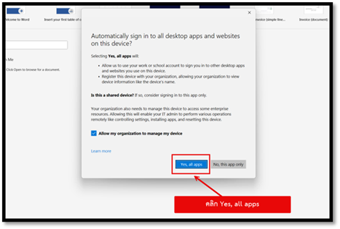 6. ระบบจะแสดงหน้าต่าง Automatically sign in to all desktop apps and websites on the device ให้คลิก Yes, all apps ดังภาพที่ 1 – 39