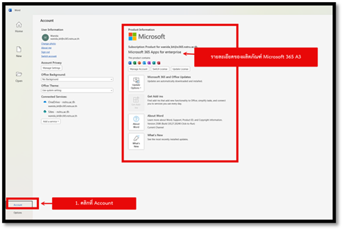 9. วิธีการตรวจสอบสิทธิ์การเข้าใช้งานว่าสามารถใช้งานได้แล้ว หากใช้โปรแกรม Microsoft Office ให้ไปที่เมนูไฟล์ แล้วคลิกเลือก Account ดังภาพที่ 1 – 42 จะแสดงรายละเอียดของผลิตภัณฑ์ โดย Microsoft License ที่มหาวิทยาลัยจัดซื้อจะเป็นรุ่น A3 สามารถเข้าใช้งานโดยใช้บัญชีMicrosoft มหาวิทยาลัยเดียวกัน พร้อมกันได้ 3 อุปกรณ์