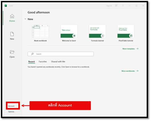 1. ให้เปิด โปรแกรม Microsoft Office มา 1 โปรแกรม เช่น โปรแกรม Microsoft word , Microsoft Excel หรือ PowerPoint เมื่อเปิดโปรแกรมมาแล้ว จะปรากฏหน้าต่างหน้าแรกของโปรแกรม โดยให้คลิกที่ เมนู Account ดังภาพที่ 1 – 33